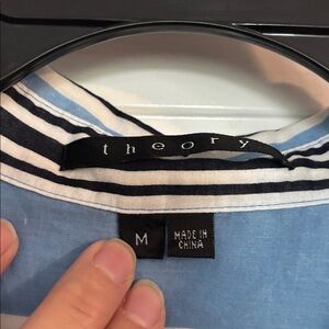 Chic blue shirt with white and black stripes. Classic button-up design.