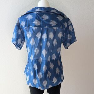 Stylish off-shoulder blouse, Theory ikat blue pattern.Lightweight and comfortable, newly dry cleaned and ready for a new home!