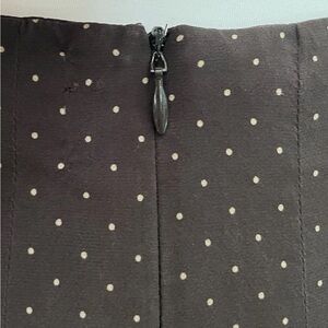 Elegant and timeless, this Theory skirt is crafted from a luxurious silk-spandex blend that drapes beautifully while offering a hint of stretch for comfort. Featuring a classic brown base with cream polka dots, pleated A-line silhouette, and hidden back zipper, this versatile piece transitions seamlessly from workwear to evening outings.