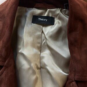Stunning, barely worn Theory suede jacket in a rich warm brown. Features a belted waist, asymmetrical zipper, and soft, high-quality genuine suede. Fully lined with satin for a smooth fit. This piece has the structure and tailoring Theory is known for — effortlessly sleek, modern, and timeless.