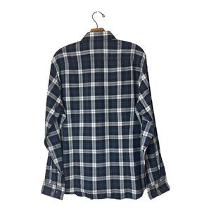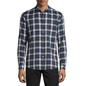 This shirt from Theory is in excellent condition. It is a navy blue and multicolor checked plaid print. It features; A collared neckline, long sleeves with button cuffs, Curved hemline, Button down front and is crafted from 100% cotton.