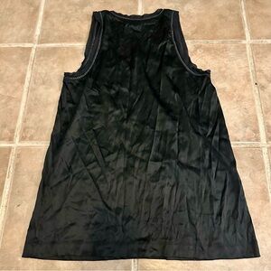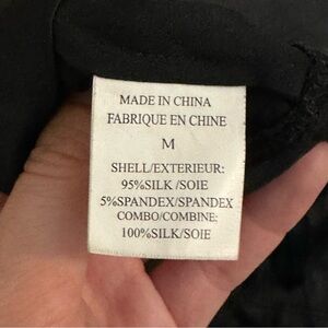 This designer shirt has a scoop neck and chest pocket edged with silver chain enclosed in sheer ribbon. Unique and beautiful. Length: 27.5". Chest: 32". Materials: 95% silk, 5% spandex