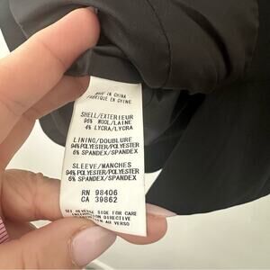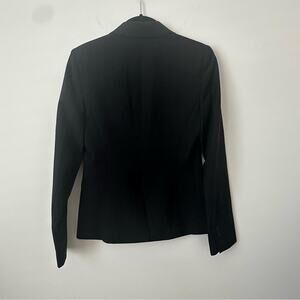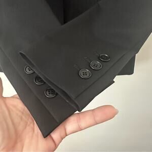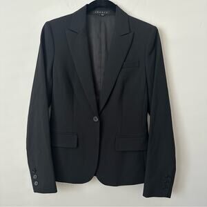 Elevate your wardrobe with this sophisticated black suit jacket from Theory. Crafted from a blend of wool and Lycra, it offers a comfortable and slightly stretchy fit, perfect for all-day wear.