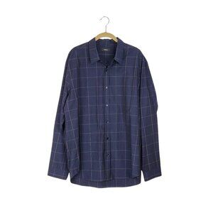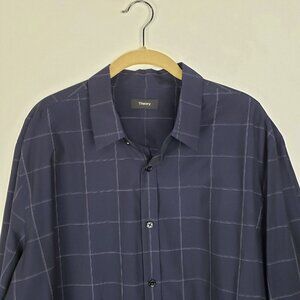 Theory Clean Placket Shirt Navy Blue Mouline Grid Cotton Button Up Mens Size XL