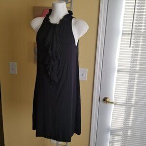 Sleeveless black dress with front zipper closure and ruffle design in front