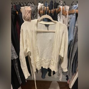 Gently worn as shown-some pilling on fabric and tag is unattached on one end but no real damage anywhere. Cute buttons on the bottom and tie around the waist. The sleeves are comfortable and are dolman style. SUPER cute for spring!