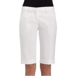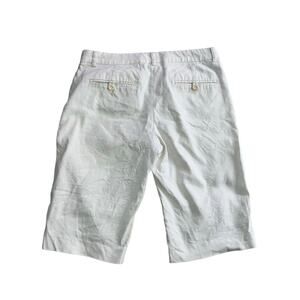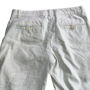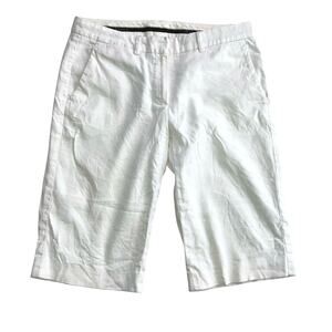 Classic coastal nautical chic linen blend shorts from Theory. Zipper and clasp closure, slot front pockets, small functional button back pockets. Mid-rise, Bermuda length. Perfect neutral to build an outfit on.