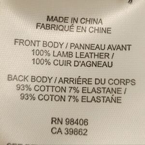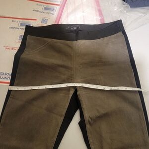 These are combo leggings: Soft Suede feeling 100% lamb leather on the front panel and black twill knit on the back. Perfect olive green and black color block combo.