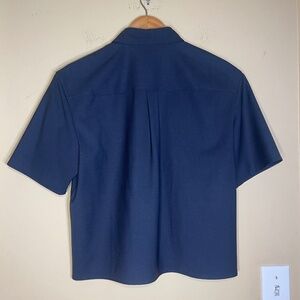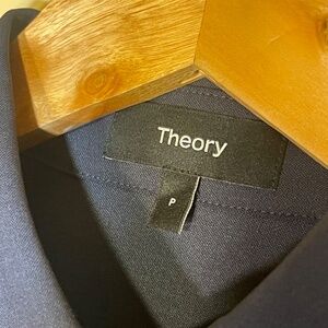 Elegant dark blue shirt by Theory. Features short sleeves and a button-up front.
