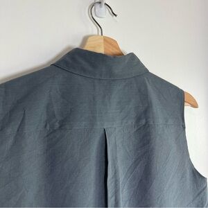This modern take on a button up is a cropped style and sleeveless. It is a dark gray and has a collar. It is in excellent used condition.