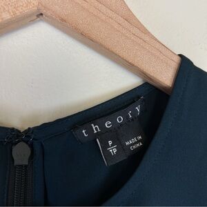 Theory Dark Mineral Teal Laycee Sleeveless Arched Hem Silk Top. Blouse. Round neckline. Arched peplum hem with side slits. Back zip closure. 100% silk. Retail: $215. Elegant, classic, office, workwear, minimalist. Size P equates size XS or 0. Armpit to armpit: 16.5". Length: 25". (467)