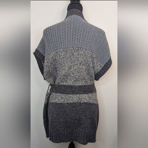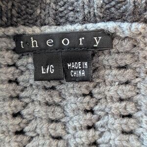 Description: Theory Gray Minimalist Quiet Luxury Cozycore Knit Cardigan Alpaca Dena Caledonia Sweater LG, open front style, marled knit, colorblock style, belted waist, medium waist