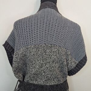 Description: Theory Gray Minimalist Quiet Luxury Cozycore Knit Cardigan Alpaca Dena Caledonia Sweater LG, open front style, marled knit, colorblock style, belted waist, medium waist