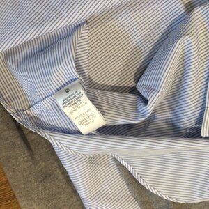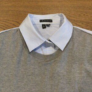 Theory Deverlyn top in Striped poplin with knit sleeves and front overlay.