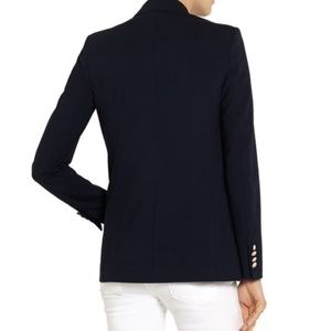Theory's 'Elkaey' blazer is tailored for a smart yet comfortable fit. The Navy Blue jacket has softly padded shoulders & a double-breasted front. It a double-breasted closure at front and welt pockets. 67% viscose, 22% polyamide, 11% elastane.