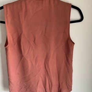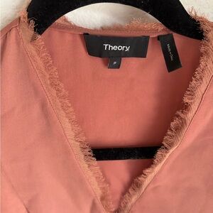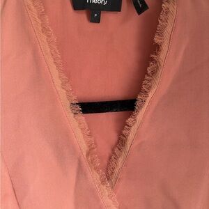 Elegant and beautiful V-neck top by Theory size small (petite) in rosy pink. Features frayed edges and is 100% silk. Few minor wear details noted in pictures.