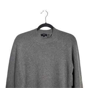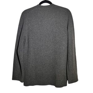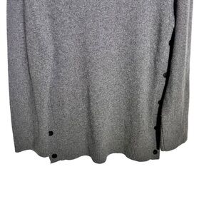 Gray / grey, soft wool-cashmere blend crewneck, pullover, tunic sweater with longline silhouette and side button details. Preowned but in good condition. 90% wool / 10% cashmere.