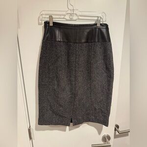 This sophisticated gray pencil skirt by Theory is designed for a polished work look. Crafted in a knee-length silhouette, it offers a sleek and tailored fit ideal for professional settings. The skirt's refined style makes it a versatile addition to any wardrobe. Real leather trim around the waist in the back. EUC