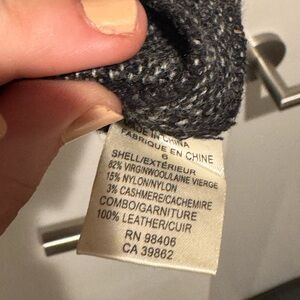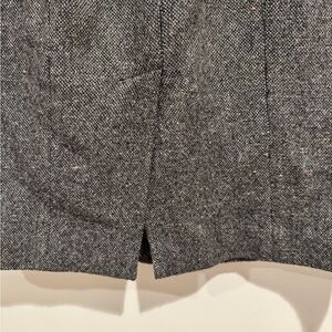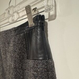 This sophisticated gray pencil skirt by Theory is designed for a polished work look. Crafted in a knee-length silhouette, it offers a sleek and tailored fit ideal for professional settings. The skirt's refined style makes it a versatile addition to any wardrobe. Real leather trim around the waist in the back. EUC