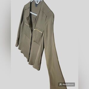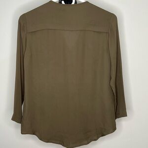 Theory Green 100% silk three-quarter sleeve zipper pocket blouse top. Button down front. Has two pockets on chest with gold zippers. 3/4 length sleeve. Size is an extra extra small XXS. See pictures for approximate measurements excellent condition.