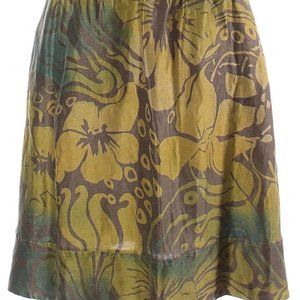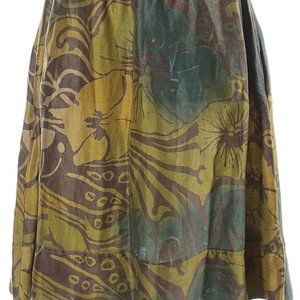 Features- Ruffle accents, Frills & ruffles, Boho, Color blocked detail, Knee length, A-Line silhouette, Green, pleated floral print, 89% Linen, 11% Silk, 2 side pockets