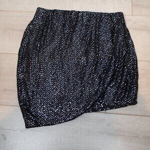 Great condition, minor wear. Theory. Hailey Skirt. Asymmetrical Hem. Black/gray/ metallic. Allover sequins. Pull on, elastic waist. Lined. Can also be worn as a top. Size P. 60% cotton, 40% modal. Waist 13.5” Waist to hem 13.5-18.5”. All measurements are approximate and taken lying flat. Smoke free home. No trades, offers welcome.