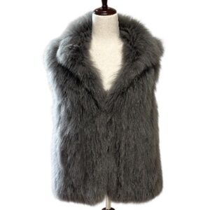 DETAILS Authentic mid-length vest made of 100% genuine dyed blue fox fur. Luxurious fur sourced from Finland. Fur is very soft, plush, lightweight, & warm. Features a stand collar, open front with hook-eye closures, & slash pockets. MEASUREMENTS Size is Large but can be worn by all shapes and sizes. I am an XS & this was an ideal layering piece over garments in fall & winter seasons. CONDITION In very good pre-worn condition. Shows wear on both arm holes, especially at the bottom of the arm hole (refer to images). Collar has mild matting where it touches the neck & some visible matting on the outside of the vest that is not visible while wearing.