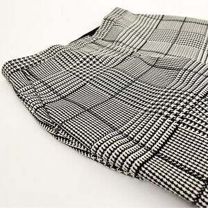 Black and ivory white houndstooth slim fit trousers with front zip and hook-and-eye closure. Diagonal pockets at sides, welt pockets at back with black button closure. Mid-low rise, fully lined.