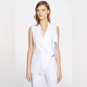 A fluttering ruffle at one side provides a statement-making detail on a double-breasted linen-blend blazer crafted in a summer-ready sleeveless silhouette.