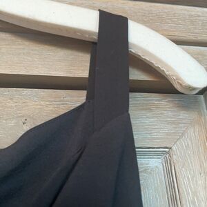 This scoop-neck Theory dress features a blouson bodice and a gathered elastic waist. Pleating at 1.5" straps. Slant hip pockets. Lined. Asymmetrical draped neckline. Dress is 100% rayon. Lining is 100% polyester. Worn once if at all. Has been dry cleaned.