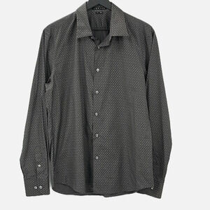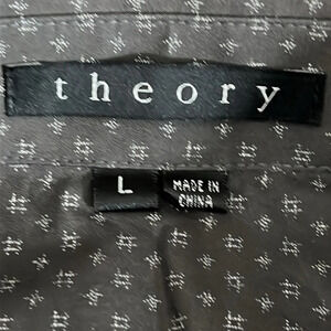 Theory Kale NP Long Sleeve Button Front MIcro Print Shirt in Gray & White - LG. Excellent pre-owned, like new condition. No pockets, 100% cotton, long sleeves with a double button cuff option, full button front, pointed collar, shirttail hem. Gray with a white micro print. Approximate measurements: 23" pit to pit, 30" length.