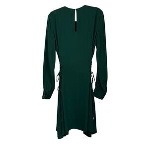 Theory “Kensington” dress in deep emerald green. Features adjustable side lace-up ties, long sleeves, and back zip closure. Perfect for work or evening events.