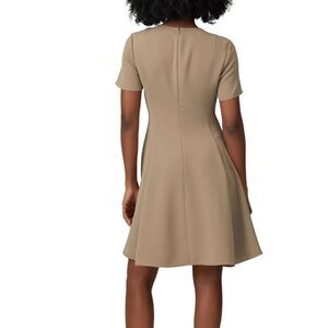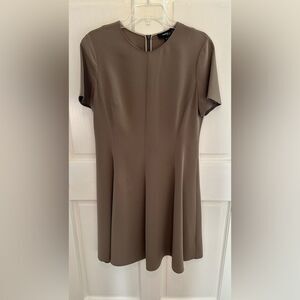 Khaki crepe (65% Traicetate, 35% Polyetser). Hourglass. Short sleeves. Crew neckline. Hidden back zipper closure. Fully lined. 37" from shoulder to hemline. Imported.