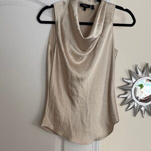 Chic cream sleeveless blouse with a draped cowl neck. Ideal for versatile styling.