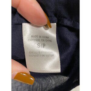 This Theory navy blue blouse features a semi-sheer design with pintuck detailing and a keyhole neckline. It comes with long sleeves and is made of 100% cotton, offering a comfortable fit for various occasions. In good condition with measurements available in pictures.