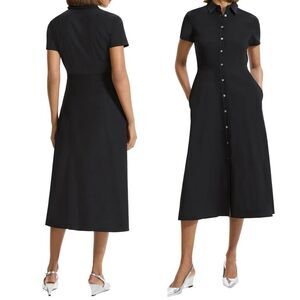 Chic and versatile, this Theory midi shirtdress features a flattering fitted bodice and an A-line skirt for effortless polish. Crafted from a breathable linen blend, it offers structure with a touch of stretch. The short sleeves, point collar, and full button front give it timeless appeal, while the side-seam pockets add everyday practicality. Perfect for work, travel, or casual days out.