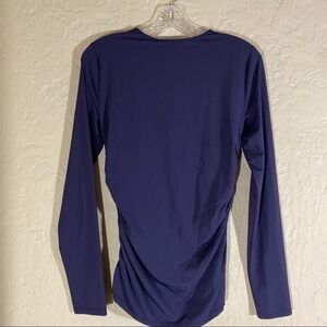 Theory ruched shell in Travel jersey. Crew neckline. Long sleeves. Formfitting. Pullover style. Nylon/spandex. Color: Plum Purple