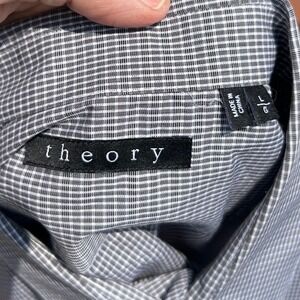 Men's long sleeve dress shirt by Theory in size Large. Features a gray and white mini check print with a modern, slim fit silhouette. Made in China, high-quality construction with a spread collar and button front. A polished and versatile piece for office wear, business casual, or elevated everyday style.