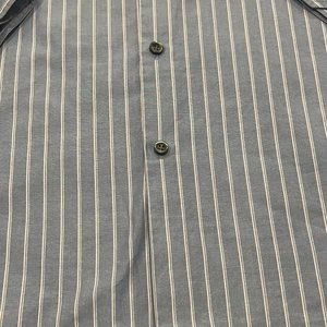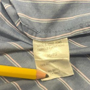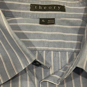 Men's size XL! Theory brand. This is the Kale Np as stated on the fabric tag of the shirt. It is blue with micro pink and white striped running vertically down the shirt. Button up and collared by design. Long sleeved. 100% Cotton. Excellent condition with no flaws noted, please see all photos and measurements for details. Smoke free home. Take a look and make me an offer!