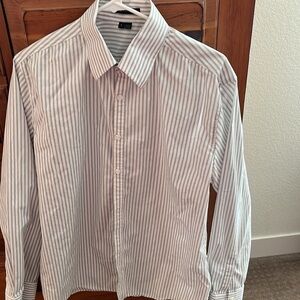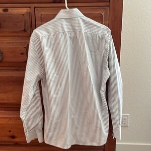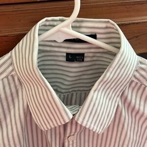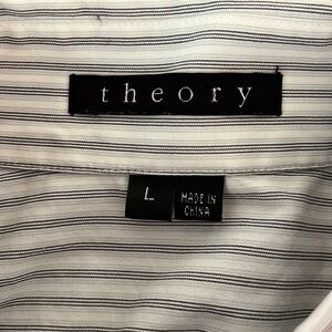 Theory Men’s gray and white long sleeved shirt, size large. The top button has a little piece missing but can still button it.