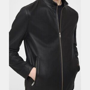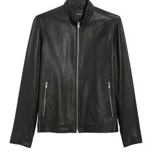 Product Details Designed with a sleek silhouette, classic collar, and versatile two-way zip closure, this refined jacket combines style and practicality. Featuring both interior and exterior pockets for enhanced functionality, it is expertly crafted from premium lamb leather, offering a soft, luxurious feel and timeless appeal for any season. Style# F0170411 Fit Runs true to size; select your usual size Regular fit with long sleeves Hits at the hip for a classic length Model is 6’2” with a 38” chest, wearing a US size M Materials & Care Composition: 100% Lamb Leather Care: Avoid washing, bleaching, tumble drying, ironing, or dry cleaning. Opt for professional leather cleaning only. Imported.