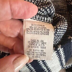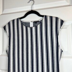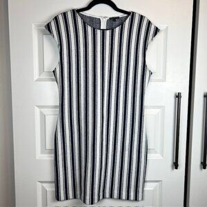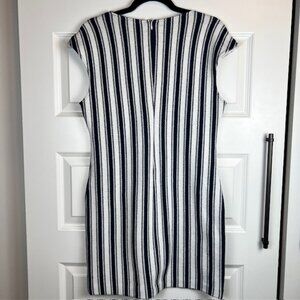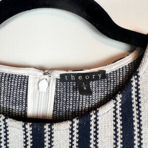 Elevate your wardrobe with this stunning Theory striped sheath dress in size Large. Designed with a modern minimalist aesthetic, this dress features navy and white vertical stripes that elongate the silhouette. Crafted from a high-quality cotton blend with slight stretch (78% cotton, 20% polyester, 3% polyamide, 1% elastane), it offers both comfort and structure.