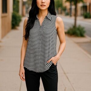 Theory Navy White Striped Silk Blouse in Excellent Pre Loved Condition