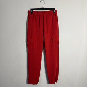 The Theory Northsound Cargo Joggers Pants in red are a stylish and versatile option for women. These mid-rise, tapered-leg pants feature a pull-on closure and an elastic waist for a comfortable fit. Made from a chiffon fabric blend, they are lightweight, breathable, and stretchy, making them perfect for a variety of occasions including casual wear, business meetings, or even a party. With their slimming features and practical pockets, these cargo joggers offer a chic and practical option for any season.