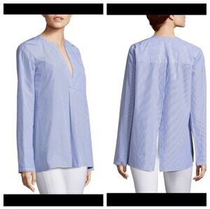 Theory Ofeliah Tunic Top Cotton Pullover Blouse Top Striped Blue White. V-neck, split tail in the back. Long sleeves. Lightweight 100% cotton. Measures 19.5" across the underarms, 28" length.