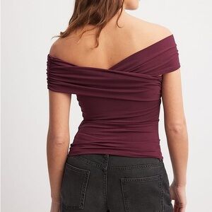 Chic off-shoulder fitted shirt in deep burgundy. Perfect for going out or elevating jeans.