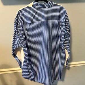 Menswear inspired Theory shirt with bold white and blue contrast. White in the front and blue with white stripes in back. Ideal for versatile wear. Size Medium/ Large. Fits oversized. New without tags. I never wore it.
