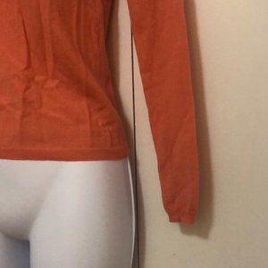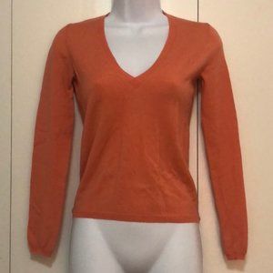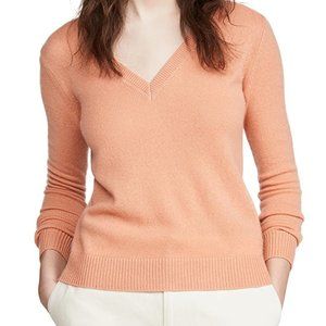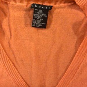 Theory Peach V-Neck Lightweight Wool Sweater with ribbed trim. Long sleeves. Size P. Measures 21" from shoulder to hem. 94% Wool 6% Nylon.