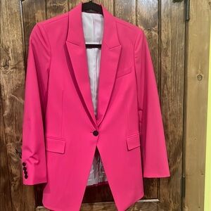 This vibrant pink blazer from Theory is a standout piece in any wardrobe. Crafted with a structured fabric, it features a classic design with notched lapels and a slightly relaxed fit. Perfect for adding a pop of color to your ensemble. NWOT.