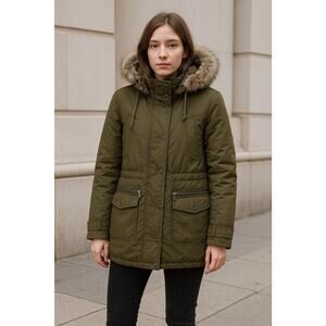 Theory Rabbit Fur Trim Hooded Parka/Anorak Coat Army Green Sz S Winter Outdoors